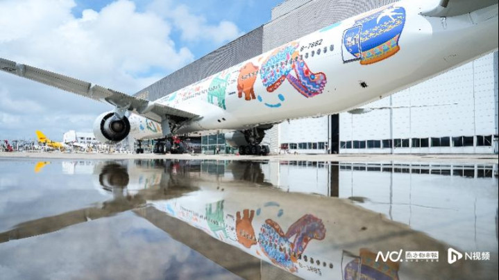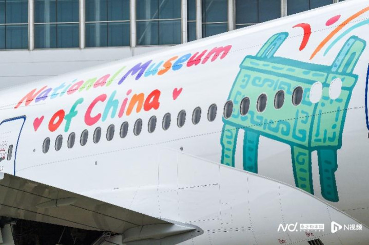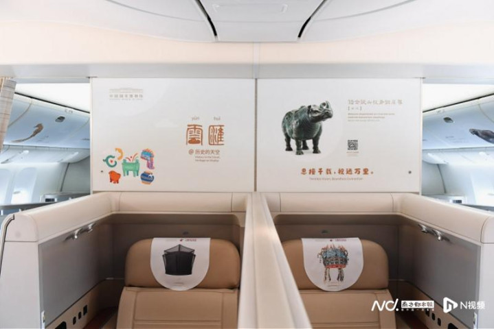 “国博号”机身涂装采用童真稚趣的儿童画风格,精选了6件跨越五千多年的国宝——玉龙、玉凤、陶鹰鼎、后母戊鼎、九龙九凤冠和海晏河清尊。