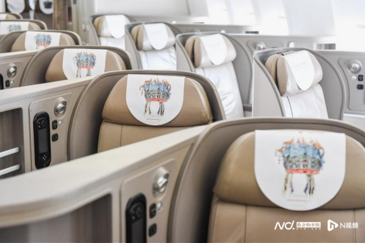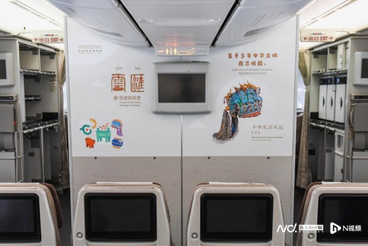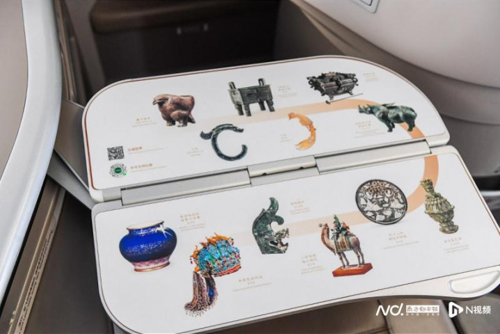 机舱内的行李架上按历史顺序展示国博馆藏中国古代各历史时期的代表性文物,每件文物都配有一句生动文案,取放行李的间隙,就能与文物来一场跨越时空的对话。座位小桌板上的文物图案不仅好看,还能扫码互动,访问中华文明云展和云端国博。椅背上的头枕巾有三款设计:凤冠、东坡巾、祝福语。把凤冠或东坡巾“戴”上,自拍一张,发朋友圈绝对收获满满点赞。此外,机载视频内还有国博精彩展览、文物导赏供乘客点播。国博专刊亦奉上“古代中国”百件瑰宝精美图片和介绍,展示国之瑰宝的奇思妙用和细节之美。
